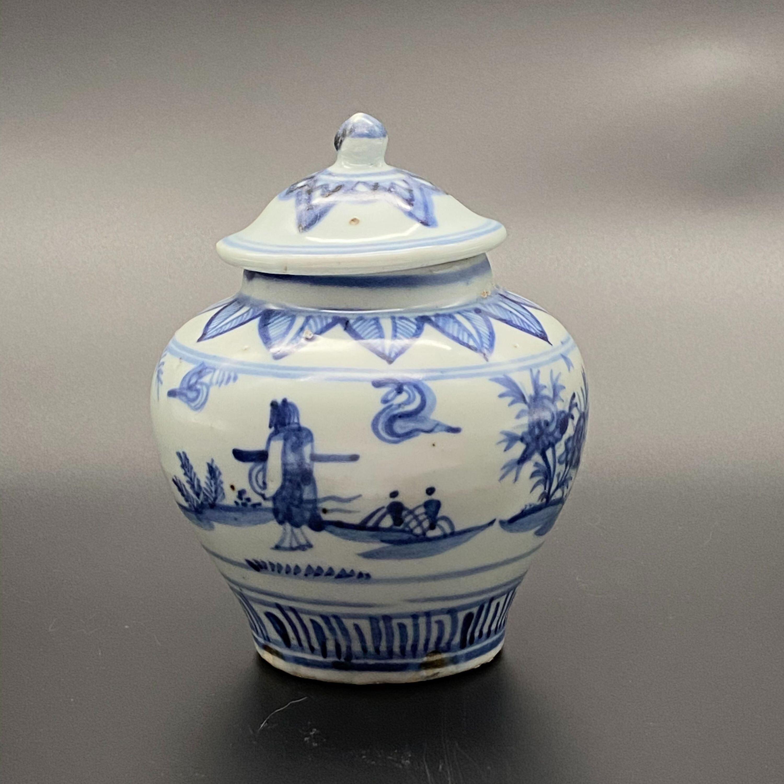 青みががかった釉薬と落ち着いた染付で華やかさはありませんが、大きさもかわいらしく手に取りたくなる小壺です。